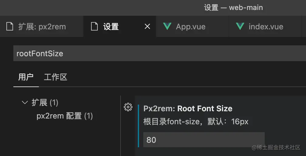 打开vs code 设置,搜索rootFontSize,将默认的16px改成我们需要转化成rem的数值(以设计稿1920为例,flexible.js中80px = 1rem,那么rootFontSize应设置成80),保存后重启。