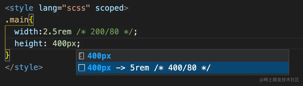 在css中输入px就可以看到如下的提示,我们选择转化后的rem就可以