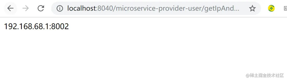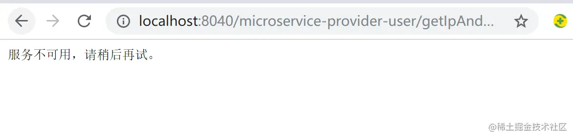 关闭zuul代理的用户微服务,再运行本项目,访问地址:http://localhost:8040/microservice-provider-user/getIpAndPort,将会返回如下内容