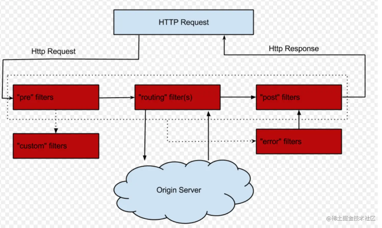 - 通过前置过滤器"pre fiters" ,"routing fiters"访问后端的微服务,"post fiters"返回给客户端