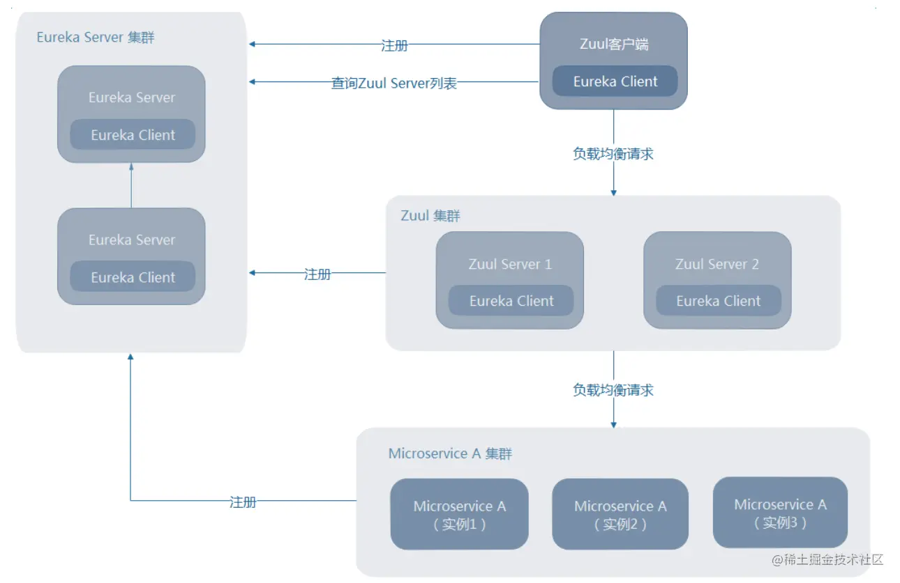 当zuul客户端也注册到Eureka Server上时,只需部署多个Zuul节点即可实现其高可用。zuul客户端会自动从Eureka Server中查询zuul Server的列表,并使用Ribbon负载均衡地请求Zuul集群。