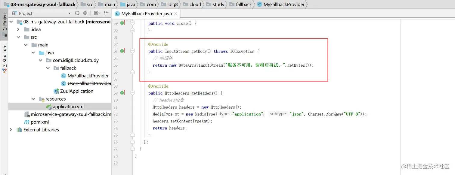源码:08-ms-gateway-zuul-fallback 编写zuul的降级回退类如下