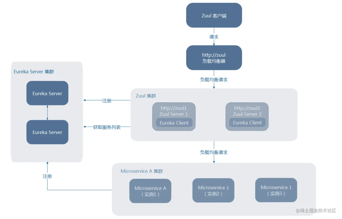 zuul客户端将请求发送到负载均衡器,负载均衡器将请求转发到其代理的其中一个zuul节点。这样,就可以实现Zuul的高可用。