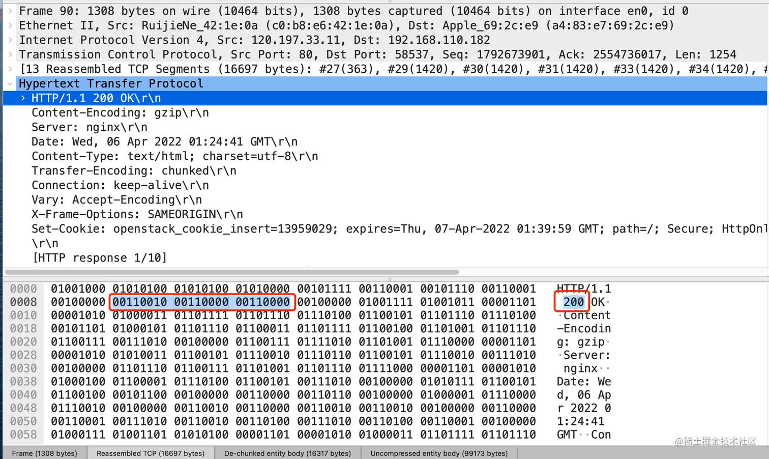 比如状态码 200 ,在 HTTP/1.1 是用 '2''0''0' 三个字符来表示(二进制:110010 110000 110000),如图: