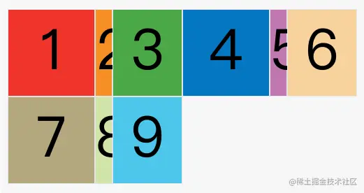 除了1号项目以外,其他项目都没有指定位置,由浏览器自动布局,这时它们的位置由容器的grid-auto-flow属性决定,这个属性的默认值是row,因此会"先行后列"进行排列。读者可以把这个属性的值分别改成column、row dense和column dense,看看其他项目的位置发生了怎样的变化。