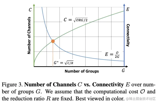 公式3的可视化如图3所示,随着和的增加,在减少。在两者的交点处,每个输出维度刚好只与每个输入维度连接了一次,其中的shuffle作用很大。从数学上来说,矩阵可分为个秩为1的小矩阵,从小节开头处的分解示意图可看出,矩阵中小矩阵实际为矩阵的列与的行的矩阵相乘结果(去掉空格)。
