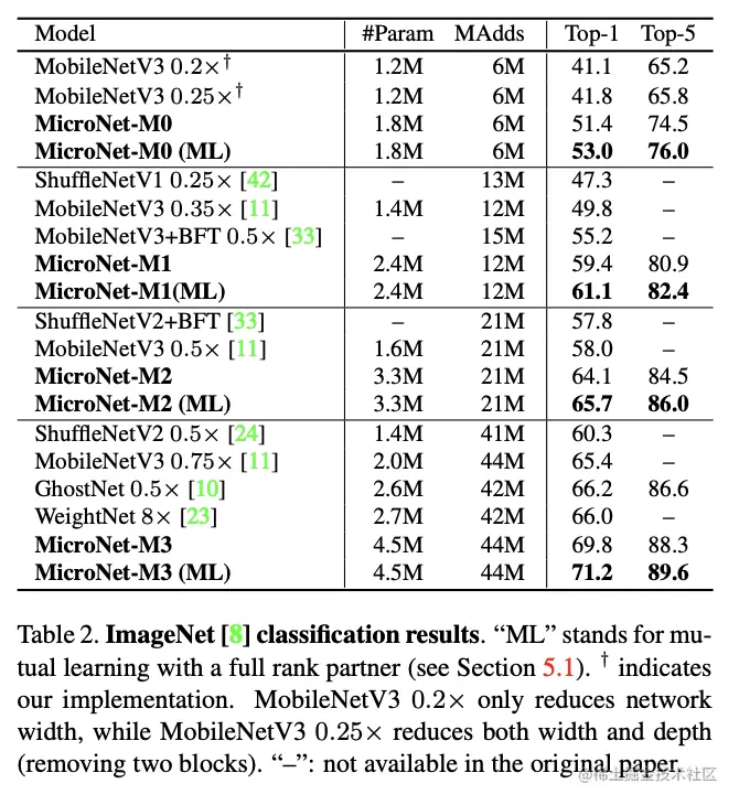为此,论文在设计MicroNet时主要遵循两个设计要领:1)通过降低特征节点间的连通性来避免网络宽度的减少。2)通过增强非线性能力来补偿网络深度的减少。MicroNet分别提出了Micro-Factorized Convolution和Dynamic Shift-Max来满足上述两个原则,Micro-Factorized Convolution通过低秩近似减少输入输出的连接数但不改变连通性,而Dynamic Shift-Max则是更强有力的激活方法。从实验结果来看,仅需要6M MAdds就可以达到53.0%准确率,比12M MAdds的MobileNetV3还要高。