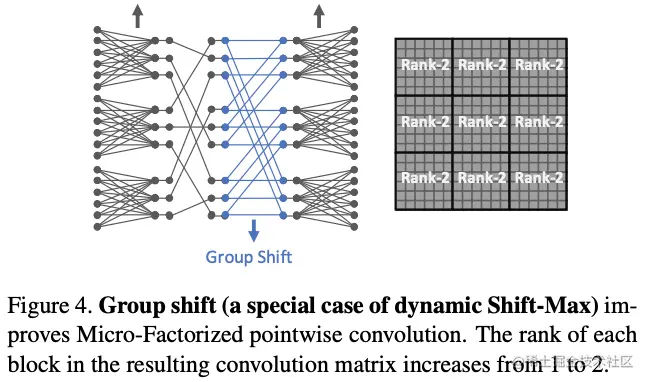 Dynamic Shift-Max能够提升组间的维度交流,弥补MicroFactorized pointwise convolution只专注于组内连接的不足。图4为简单的静态分组偏移,,以及固定的,注意排列矩阵与前面的不太一样。可以看到,尽管这样的设计很简单,但依然能够有效地提升输入输出的关联性(矩阵的秩也从1升为2)。