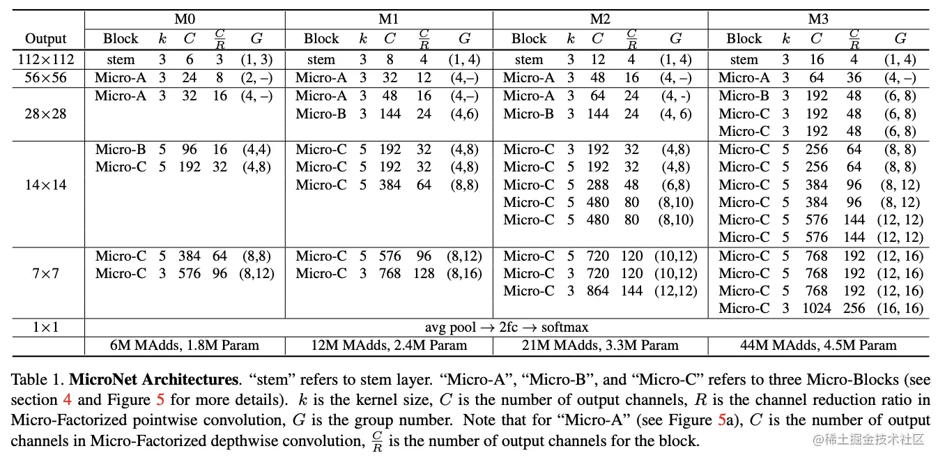 MicroNet的结构如表1所示,需要注意的是两种卷积的分组数和,论文将公式2的约束改为。