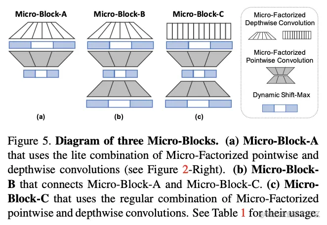 论文设计了3种不同的Mircro-Block,里面均包含了Dynamic Shift-Max作为激活函数: