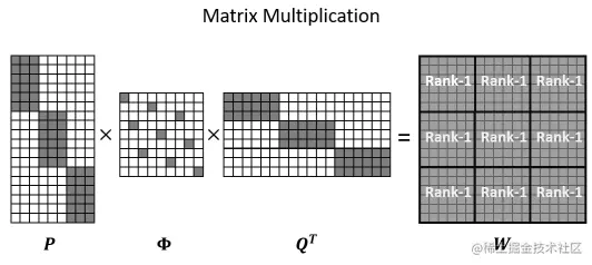 为矩阵,为矩阵,用于压缩输入,为矩阵,用于扩展输出,和均为包含个块的对角矩阵。为排列矩阵,功能与shufflenet的shuffle channels操作一样。分解后的计算复杂度为,上图展示的参数为,,。的大小由维度和下降比例而定: