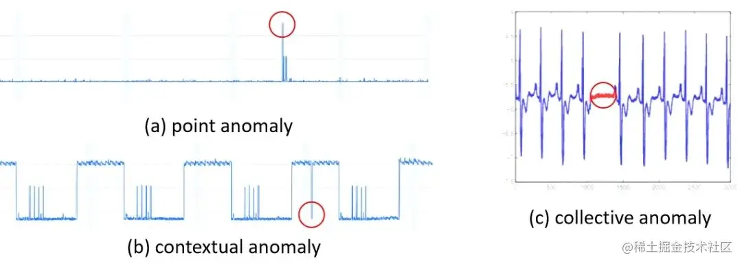 学术界将指标异常分为点异常(point anomaly)、上下文异常(contextual anomaly)与连续性异常(collective anomaly)三类。点异常指显著有别于其他点的单点异常如下图(a);上下文异常指在指标正常的变化范围内的频率异常如下图(b);连续性异常为在指标正常变化范围内模式发生的变化如下图(c)。