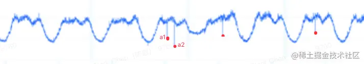 时间序列数据中数据点的信息即包含其数值的信息,也包含其所处的时间点信息。通常将通过数值信息识别的异常称为空间异常,无法仅通过数值信息识别的异常称为时间异常。如图1所示,a1异常点,单从数值上无法将其区分出来,但考虑时间信息,历史同期没有相似的模式出现,这类异常为时间异常,也称模式异常;a2异常点,其数值显著低于指标数据常态的数值,能够使用k-sigma等统计方式识别,这类异常为空间异常,亦被称为数值异常。(下图为空间异常与时间异常示例)