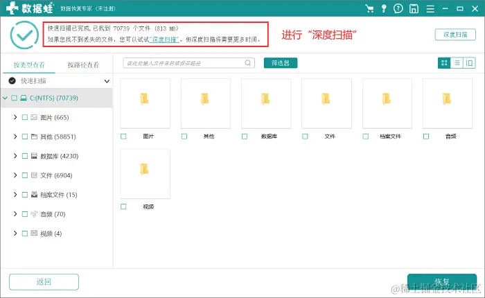 注:由于sd卡数据一般都会比较多,所以第一次扫描不一定能全部扫描到,所以如果未找到丢失文件和未找齐全部丢失文件的小伙伴,请进行“深度扫描”!