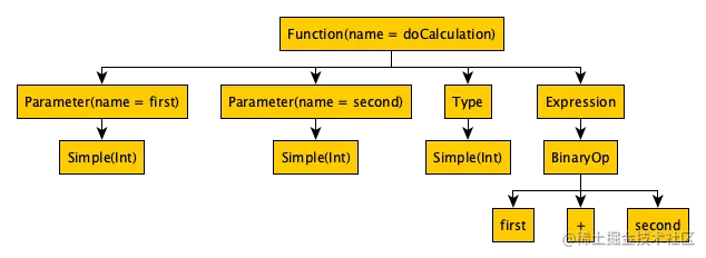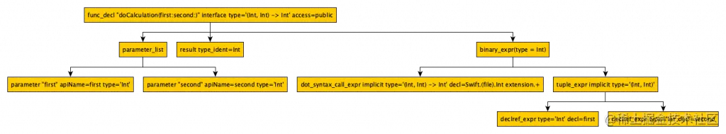 这一次,我们使用了一个名为doCalculation的函数,以及两个整数参数first和second。AST还包含我们定义的返回类型的信息,即Int。最后,实际的计算被存储在AST的表达式节点中,就像我们第一个例子一样。