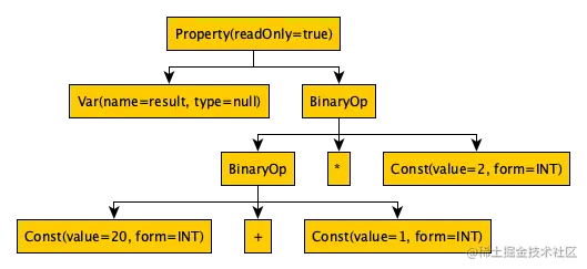 同样,编译器看到我们想把我们的值存储为一个只读的属性。就像之前的+运算符一样,也需要2个参数,因此也是由一个BinaryOp节点表示。然而,我们现在不是像以前那样将2个常数送入BinaryOp,而是将另一个BinaryOp20和1的加法送入乘法。因此,执行顺序隐含在树中,因为BinaryOp必须先被执行,然后才能被送入乘法。
