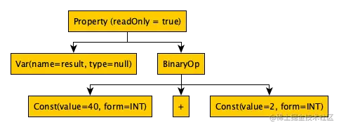 首先,编译器意识到我们要存储一个值(在这种情况下作为一个成员属性),并且这个属性应该是只读的(与var result = 40 + 2相反,后者是可变的)。除此之外,它还存储了变量的名称,并且类型还需要被推断(type=null)。我们在计算中使用的+运算符是一个所谓的二进制运算符(在树中简称为BinaryOp),因为它需要两个参数:+前面的数字和后面的数字。