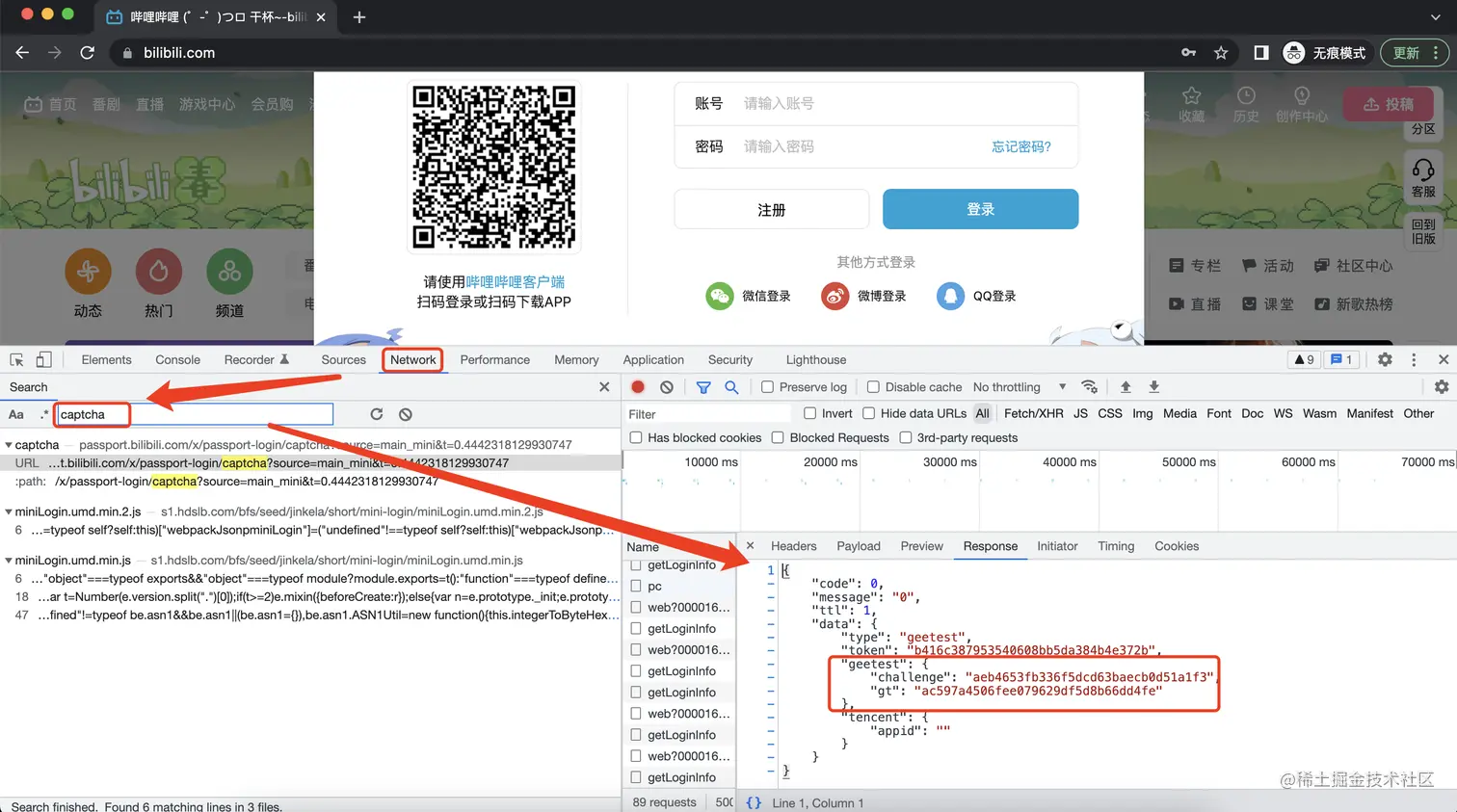 由于验证码的英文是 captcha ,我们在 network 面板里搜 captcha