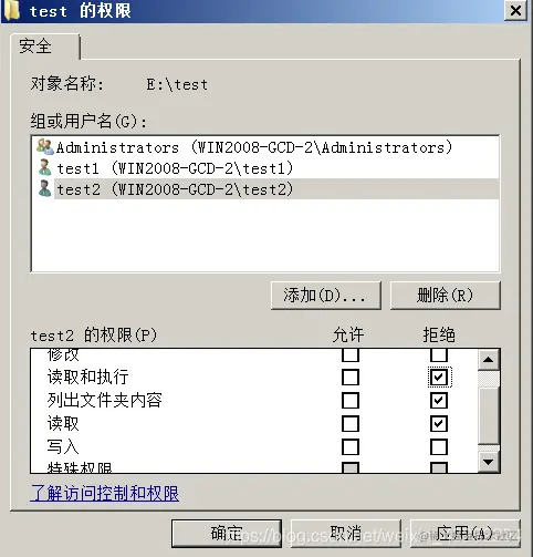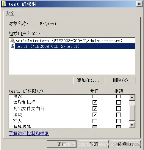 在windows 2008 系统上,创建2个新的用户,给与这两个用户不同的权限于test文件夹,依次验证
