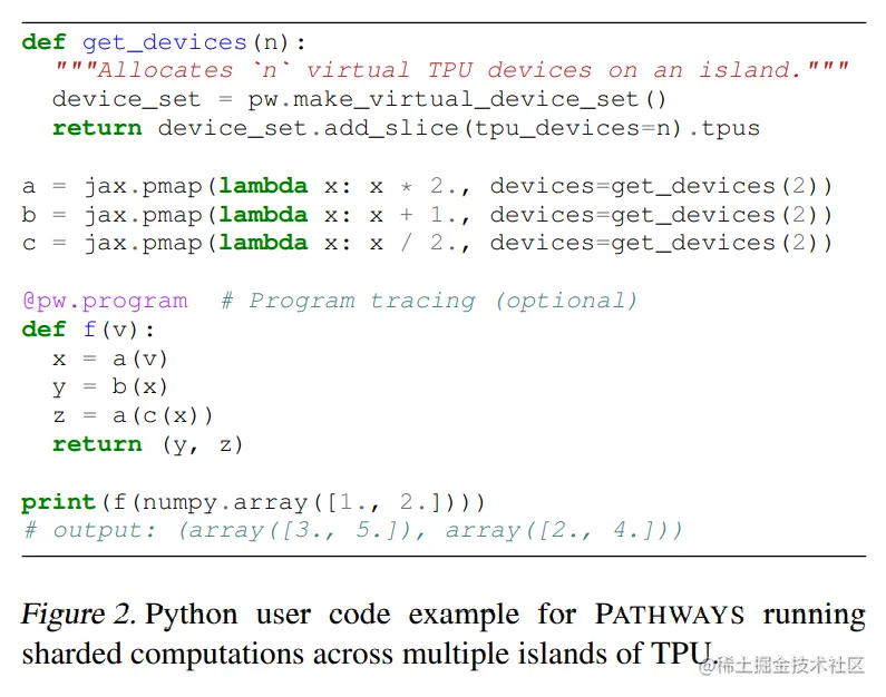 为便于理解 Pathways 的设计理念,我们先简要回顾一下它的设计目标是什么。Pathways 认为未来的 AI 模型不是 SPMD 所能描述的,得用MPMD(譬如流水并行这样的任务)。简单来说, MPMD 是由多个 SPMD 构成的,每个 SPMD 是同一个 computation 在一组设备上通过 GShard 或 GSPMD 的方式来均匀、对称的划分。我们用 Pathways 论文里的一个例子来说明。