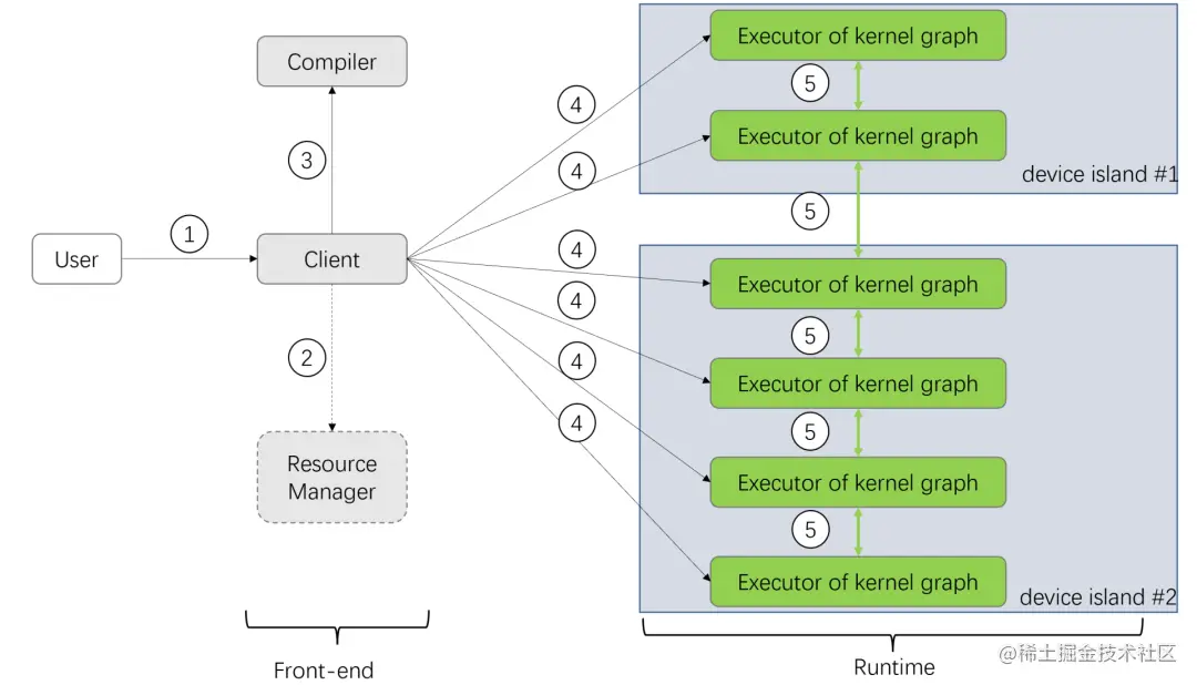 第④步,Client 把编译生成的底层表示转换成一个能被 PLAQUE 识别的数据流图(dataflow graph),并发送给运行时(runtime)系统去执行。Pathways 运行时系统缺失很多细节,特别是依赖于一个语焉不详的闭源系统 PLAQUE,这是一个谷歌内部使用的、闭源的数据流执行引擎。