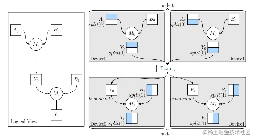 上图左半部分相当于逻辑层次的数据流图,右半部分相当于是物理层次的数据流图。对这个问题感兴趣的朋友可以阅读 GSPMD 论文《GSPMD: General and Scalable Parallelization for ML Computation Graphs (arxiv.org/pdf/2105.04… 》和 OneFlow论文《OneFlow: Redesign the Distributed Deep Learning Framework from Scratch(arxiv.org/pdf/2110.15… 》。二者还有一些微妙的区别,我在博客 《如何超越数据并行和模型并行:从 GShard 谈起》也做过对比讨论。值得一提的是,PyTorch 正在推进一个和 SBP 抽象一样的方案 (github.com/pytorch/pyt… ,不过那里的逻辑张量被称为 ShardedTensor。百度 PaddlePaddle 也在最近引入了 global tensor 这样的抽象。