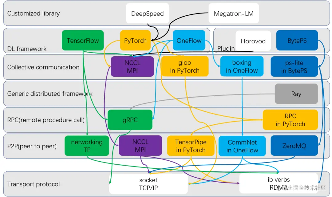 Pathways 论文已经讨论了使用 Ray 来实现的可能性,指出了一些很重要但 Ray 还没做的事,包括:(1) object store 支持 HBM 等设备内存管理;(2)支持设备间高速数据传输,譬如NVLink 和 RDMA;(3) 基于 Ray 开发一个数据流引擎进行依赖管理。