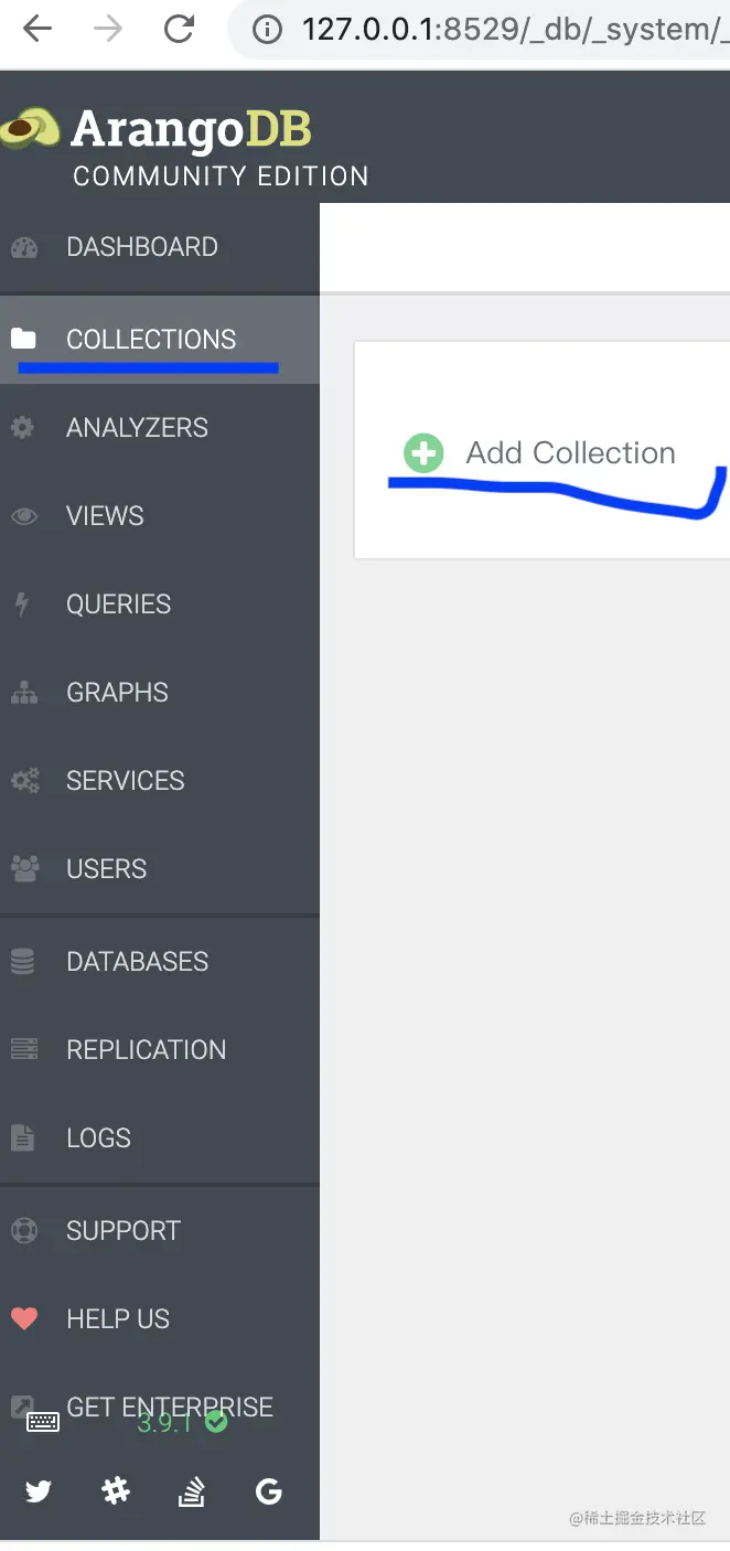 在web界面中,左侧的菜单栏里选择 COLLECTIONS, 随后点击空白处的 Add Collection,添加一个 名为 users 的collection,其他选项不用修改(保持users是一个 document collection)并保存,随后会看到刚建立的名为 users的项弹出。