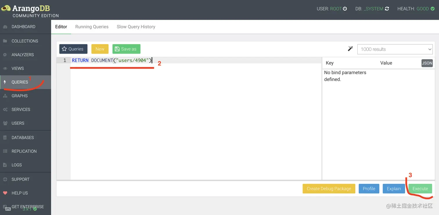 从左侧菜单栏中,选择 QUERIES,在右侧的编辑窗口中,输入如下AQL语句(把document _id换成你本地的_id), 然后点击右下角的 Execute执行, 查询结果会直接出现在编辑窗口下方。