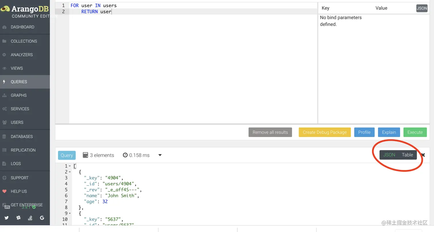 执行结果有两种显示方式 Table/JSON, 如图4.6所示,可以来回切换: