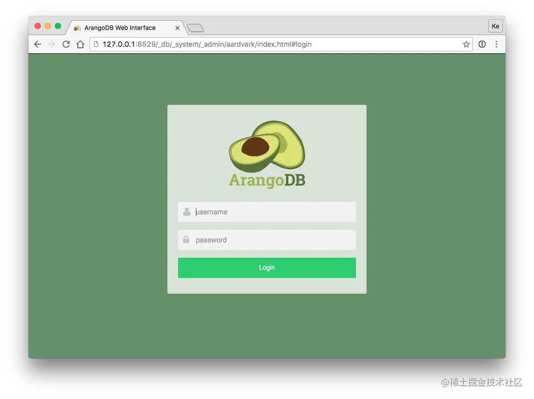 本节介绍Web界面,当安装完成之后,Server会自动启动,此时可以用http://localhost:8529打开web界面,之前提到默认的用户名是root,如果没设置过密码,则为空