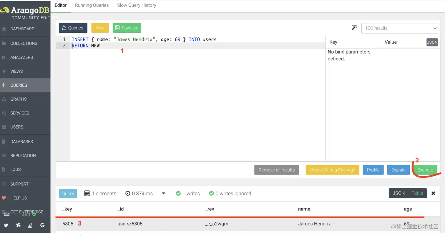 INSERT { name: "James Hendrix", age: 69 } INTO usersRETURN NEW