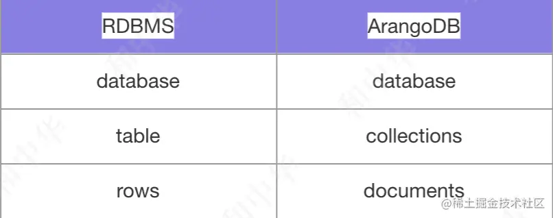 本节介绍几个术语。使用传统的RDBMS类比,会发现ArangoDB与MongoDB中的术语一样。在Arangdb中,用户无需提前定义documents中有哪些属性