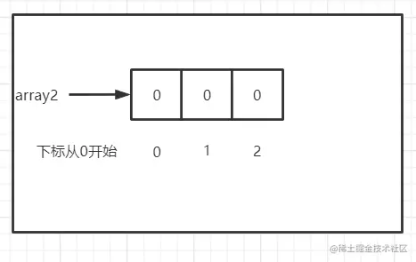 创建了一个 int 类型、长度为 3 的数组,引用名为 array2,存放了 3 个 int 类型的元素,值都默认为 0。