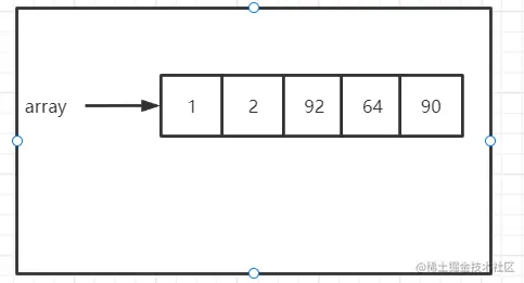 创建了一个 int 类型、长度为 5 的数组,引用名为 array,存放了 5 个 int 类型的元素,分别为 1、2、92、64、90。