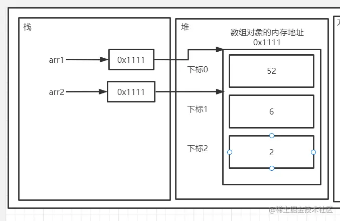 arr1 保存的值为数组实例的内存地址,假设为 0x1111,然后拷贝一份地址(创建副本)给 arr2,本质还是值传递。