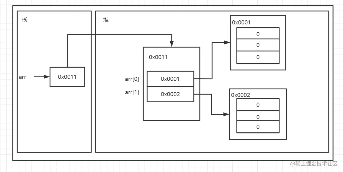 代表创建了一个 int 类型、长度为 2 的二维数组;(对于引用类型,只保存内存地址)