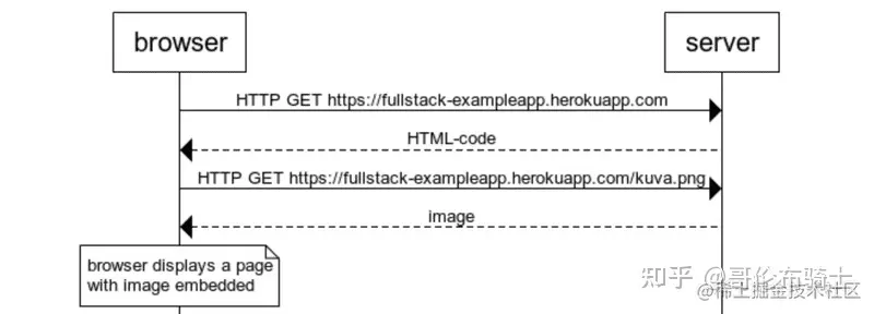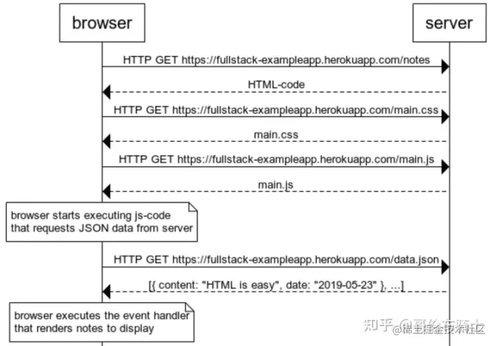 - 浏览器执行 JavaScript 代码,代码向地址[<studies.cs.helsinki.fi/exampleapp/…>](<studies.cs.helsinki.fi/exampleapp/…>) 发出 HTTP GET 请求,请求返回了包含 note 的 JSON 数据。