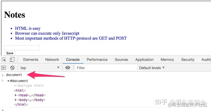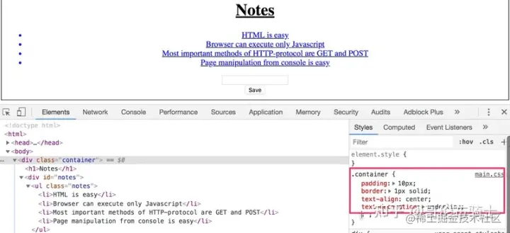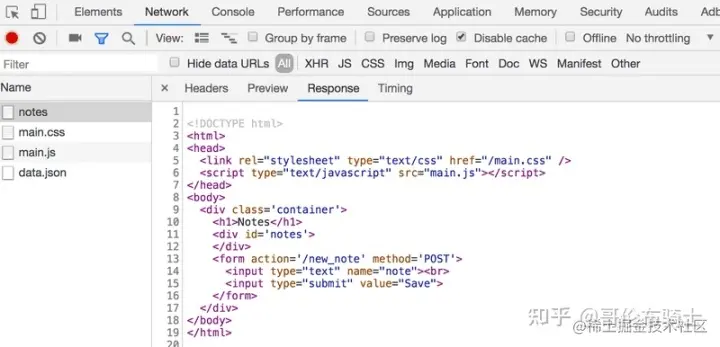 当我们比较浏览器上显示的页面和服务器返回的 HTML 代码时,我们注意到这些代码并不包含 Note 列表的数据。 Html 的 head部分 包含一个 script 标签,它会让浏览器去 获取一个名为 main.js 的 JavaScript 文件。