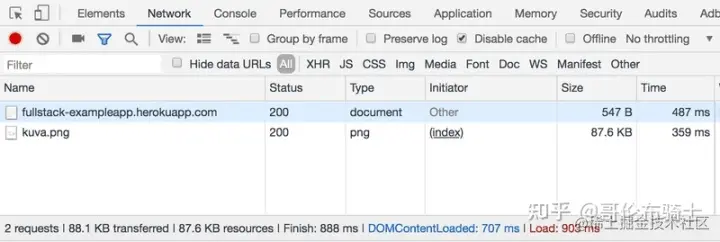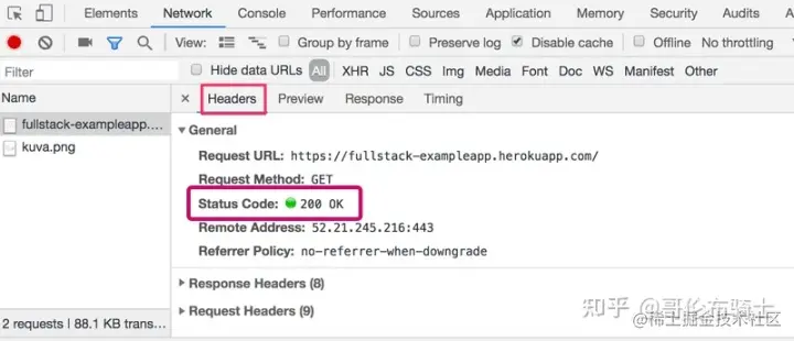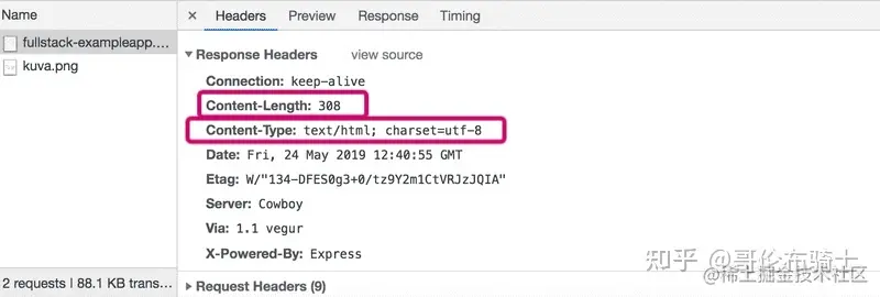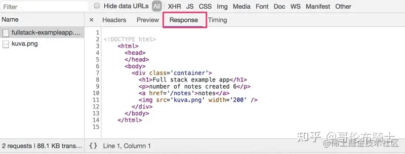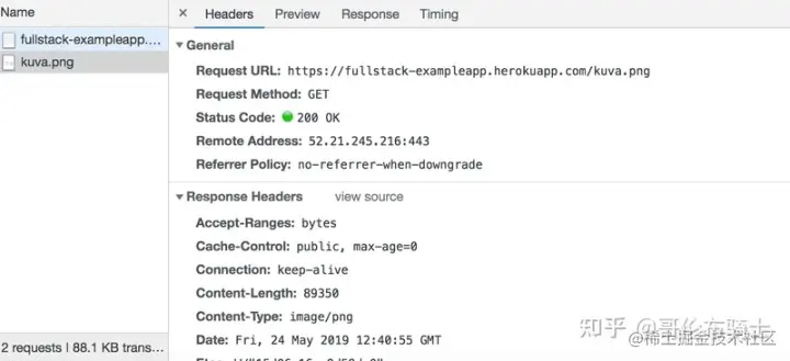 这个请求是给地址 studies.cs.helsinki.fi/exampleapp/… 发送的,它的类型是 HTTP GET。 响应头告诉我们,响应大小为 89350 字节,其Content-type为 image/png,因此它是一个 png 图像。 浏览器使用这些信息将图像正确地渲染到屏幕上。
