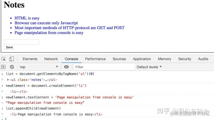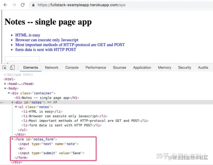 我们的应用的 Notes 页面与 SPA 风格的应用有一些相似之处,但它还没有完全到位。 尽管显示Note 的逻辑是在浏览器上运行的,但页面仍然使用传统的方式添加新Note 。 数据通过表单提交发送到服务器,服务器指示浏览器重新加载带有重定向的 Notes 页面。