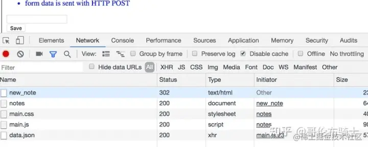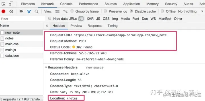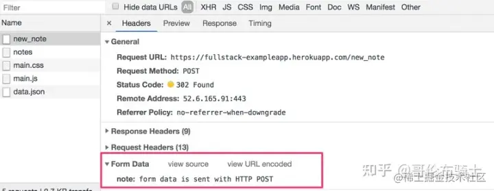 它是对服务器 /new_note地址发送的 HTTP POST请求。 服务器用 HTTP 状态码 302 进行响应。 这是一个URL 重定向,服务器通过这个 URL 重定向,请求浏览器执行一个新的 HTTP GET 请求,该请求定义在 Header 的 Location (即 /notes 地址)中。