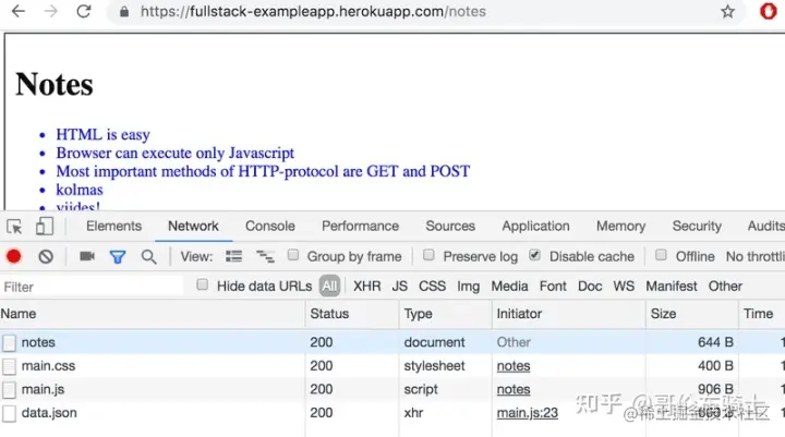 因此,浏览器重新加载 Notes 页面。 重新加载会导致另外三个 HTTP 请求: 获取样式表(main.css)、 JavaScript 代码(main.js)和 notes 的原始数据(data.json)。