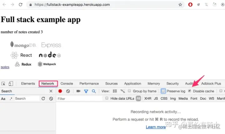 请确保打开 Network 标签页,如图所示,选中 Disable cache 选项。 保存日志(Preserve log)选项也很有用: 它能够在重新加载页面时保存应用所打出日志。