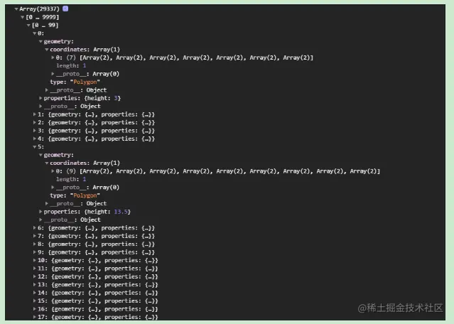 polygons里面有一个三维数组,里面包括墨卡托坐标以及高度,每一个面数据都是这样的结构