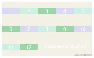 - space-around:两个项目两侧间隔相等