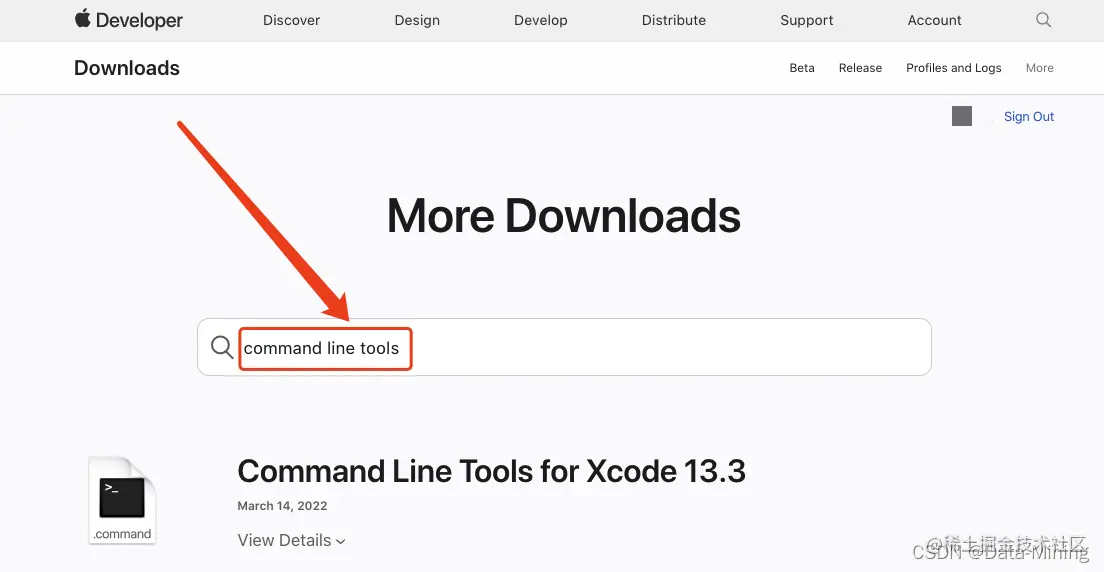 需要登陆苹果账号,登陆后在搜索框中搜索:command line tools 关键词,如下图所示: