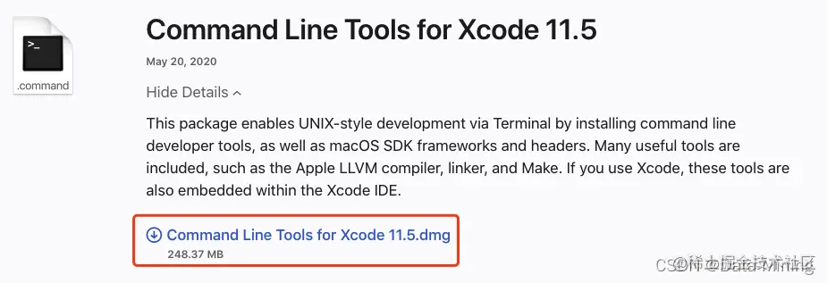 然后,根据自己本机的 Xcode 的版本,选择对应的命令行工具安装包。比如,我本机的 Xcode 是11.5,那么我们的选择如下图所示: