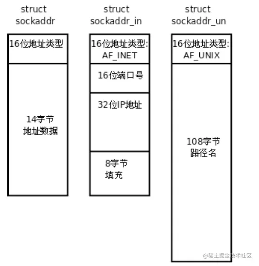 strcut sockaddr 很多网络编程函数诞生早于IPv4协议,那时候都使用的是sockaddr结 构体,为了向前兼容,现在sockaddr退化成了(void *)的作用,传递一个地址给函数,至 于这个函数是sockaddr_in还是sockaddr_in6,由地址族确定,然后函数内部再强制类型转 化为所需的地址类型