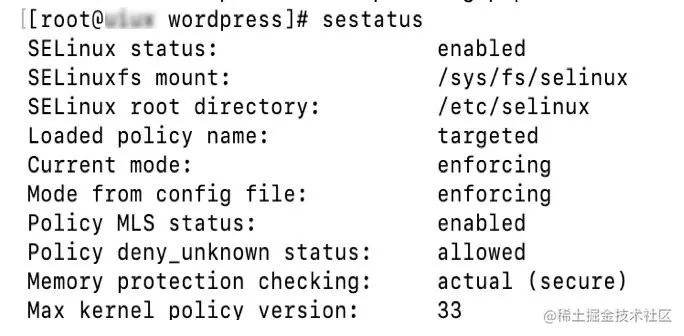 该命令提供进程状态信息,搜索Nginx特定进程信息可以看到标签。 您将看到 httpd_t,类似于以下内容: